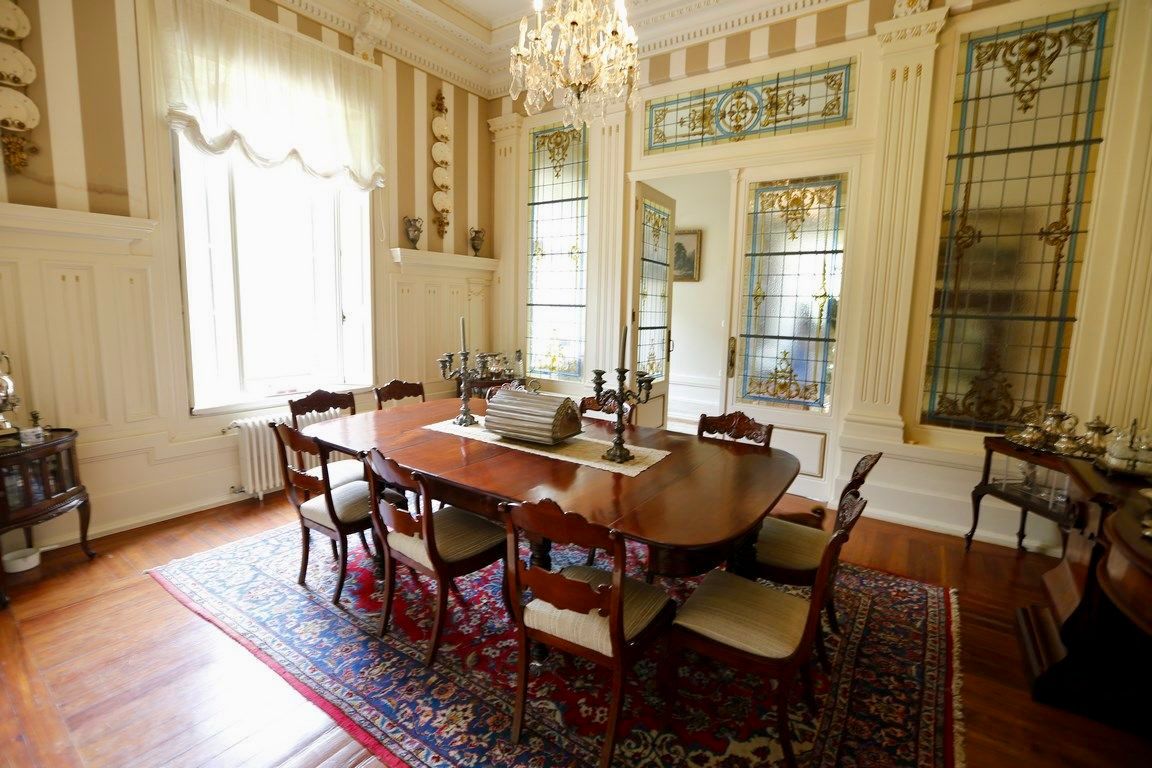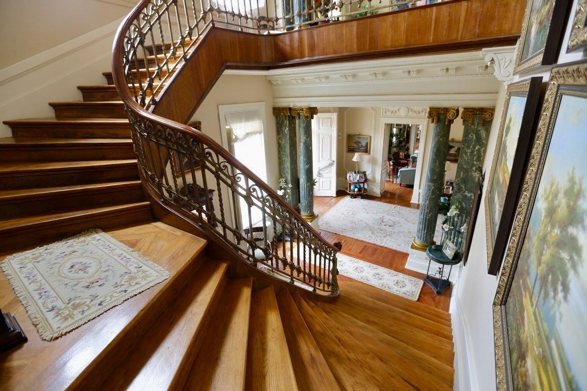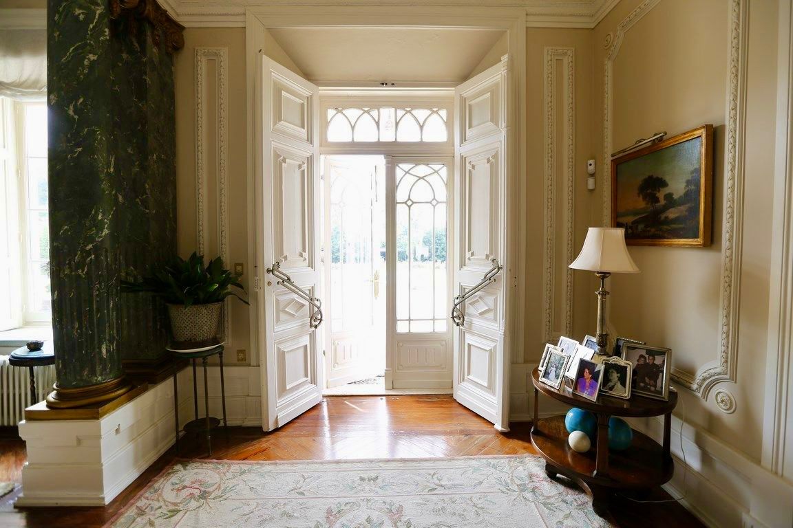 Auf einer Wohnfläche von rund 1.915 m² verteilen sich neun Schlafzimmer, sieben Badezimmer und zwei Gäste-WCs. Edle Materialien, hohe Decken mit kunstvollen Stuckarbeiten, breite Holzdielen, originale Türen und farbige Glasfenster schaffen eine Atmosphäre von zeitloser Eleganz.