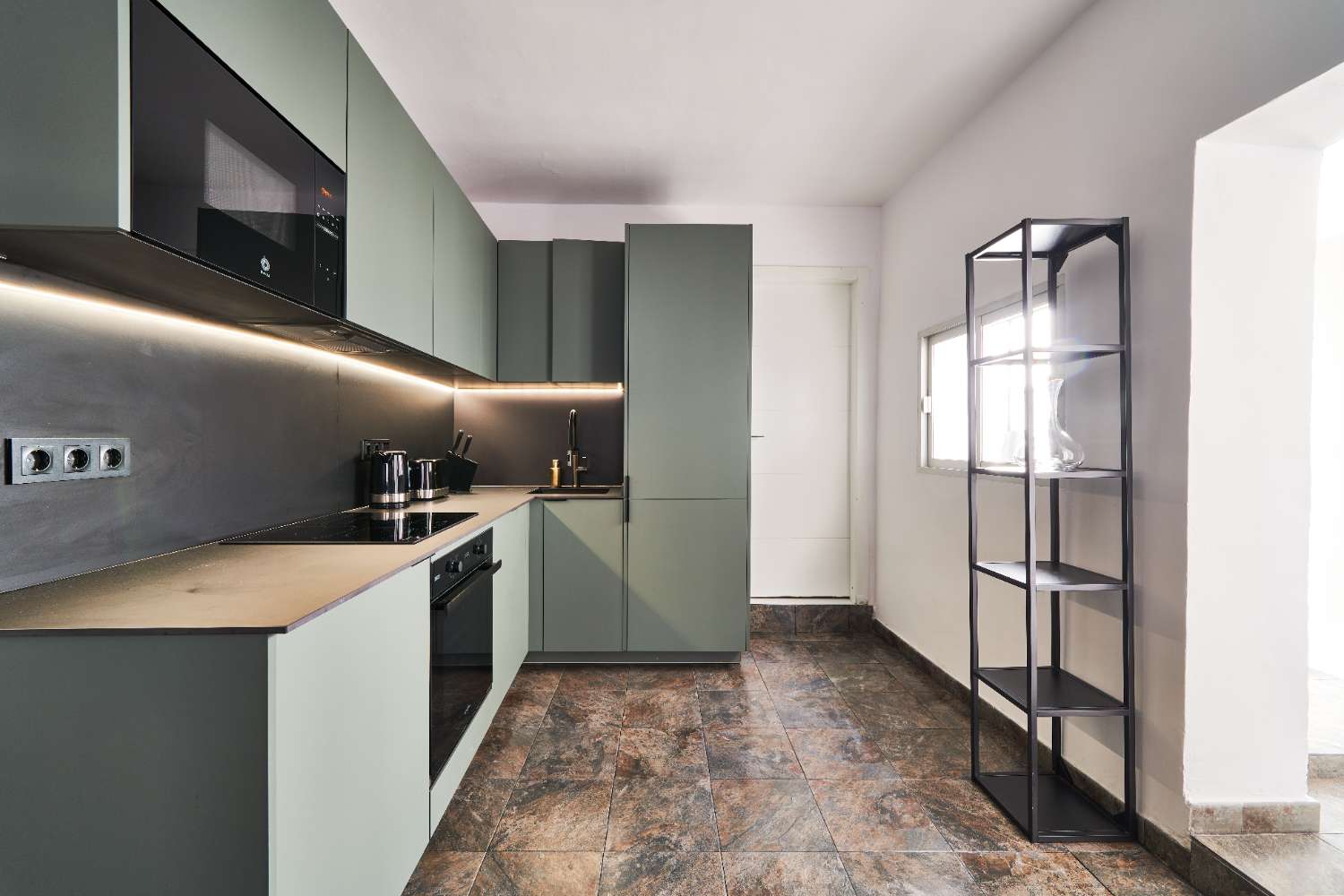 Moderne, vollständig ausgestattete Küche mit hochwertigen Geräten.